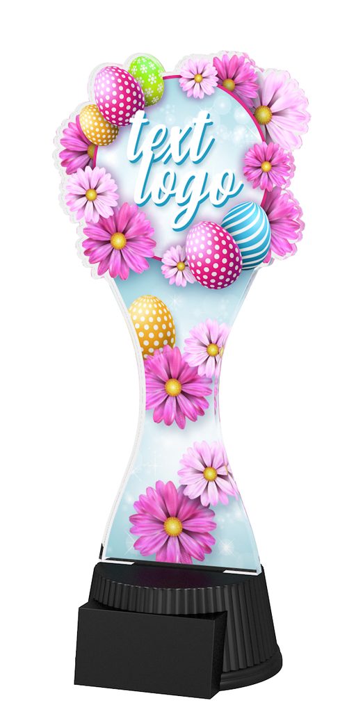 Velikonoční trofej pro všechny příležitosti. V místě: text/logo je možnost vložení vlastního loga, textu. Akrylátová trofej s UV potiskem. V ceně trofeje není zahrnuta cena štítku. Akrylátový motiv tloušťka 0.6 cm. Podstavec černý plastový. Oboustranný tisk.