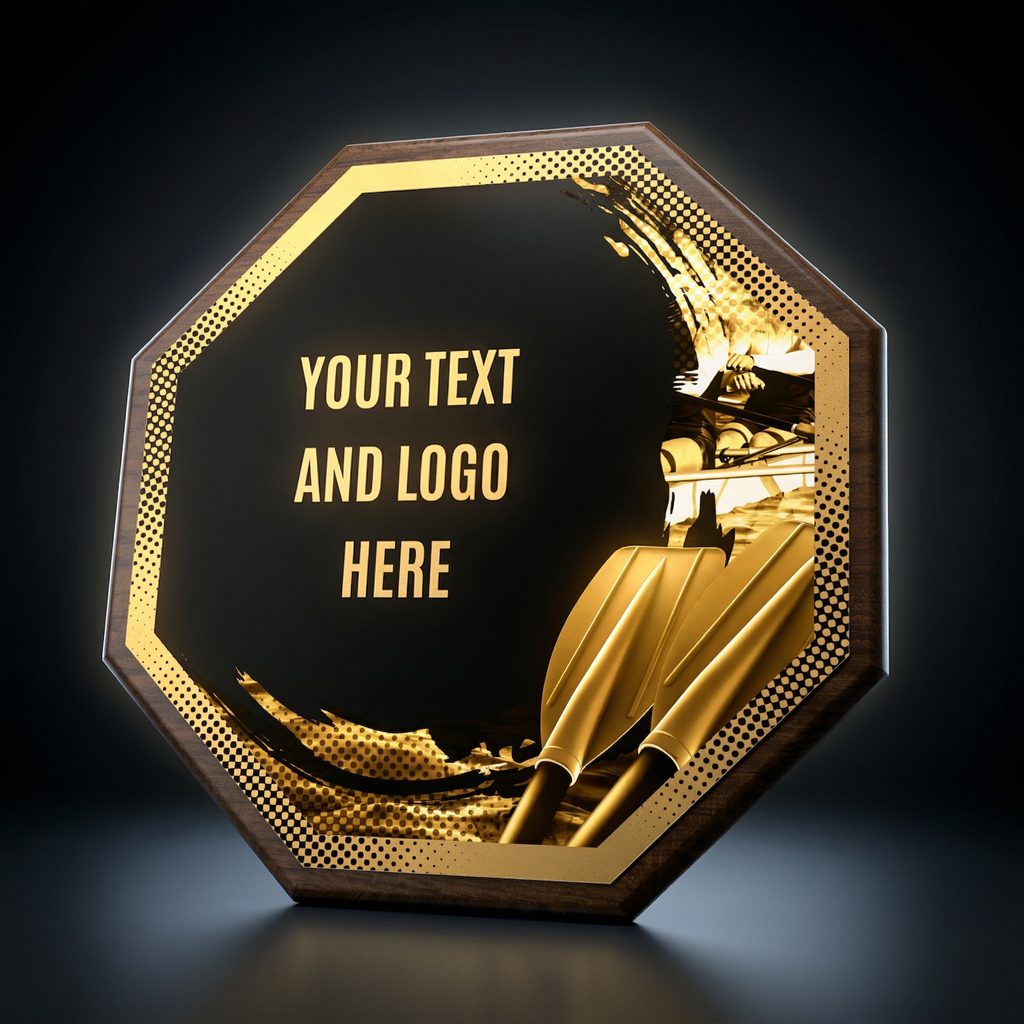 Štýlové ocenenie, ktoré kombinuje drevenú plaketu s priemerom 26 cm a hrúbkou 1,5 cm s výrazným dizajnovým stredom s priemerom 24 cm vyrobeným z kovu s UV tlačou a efektným lakom.