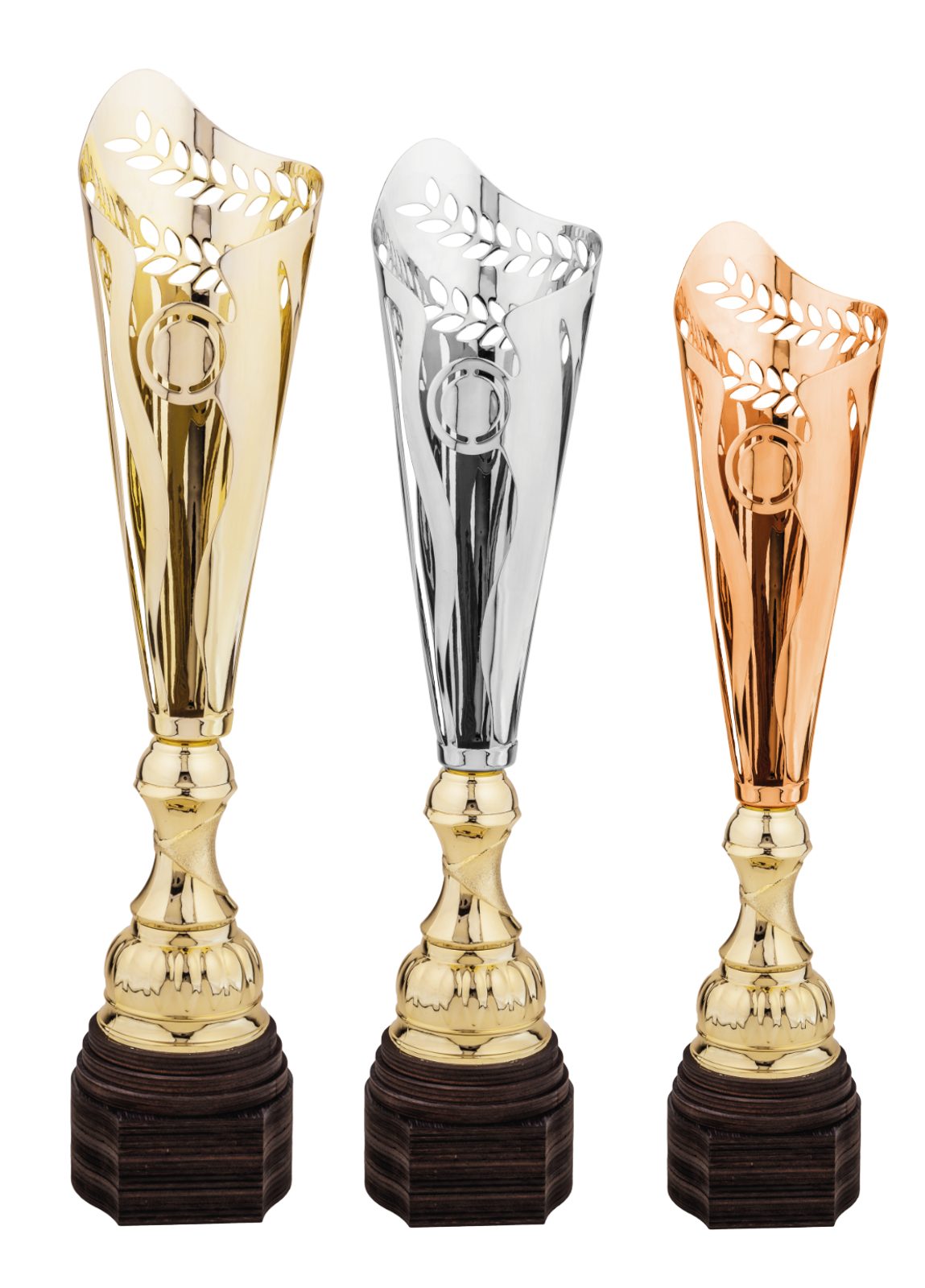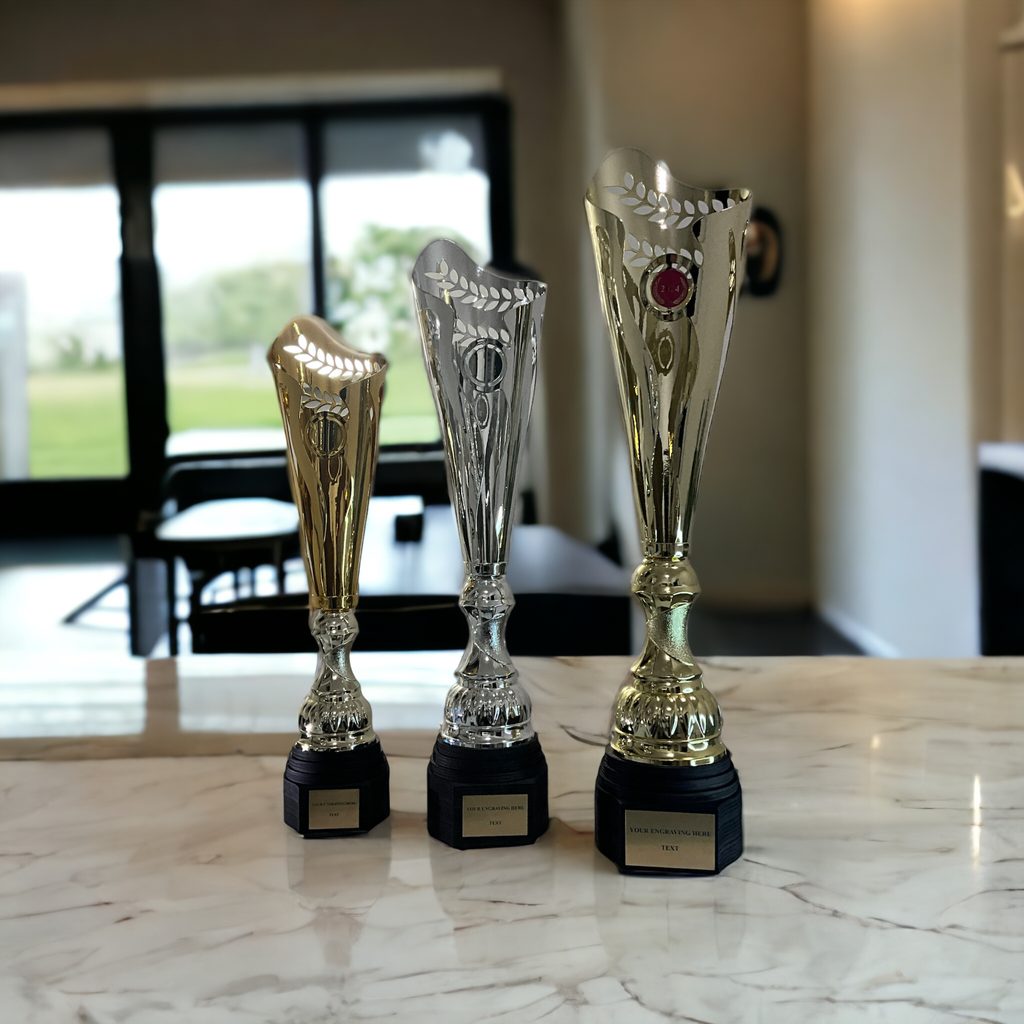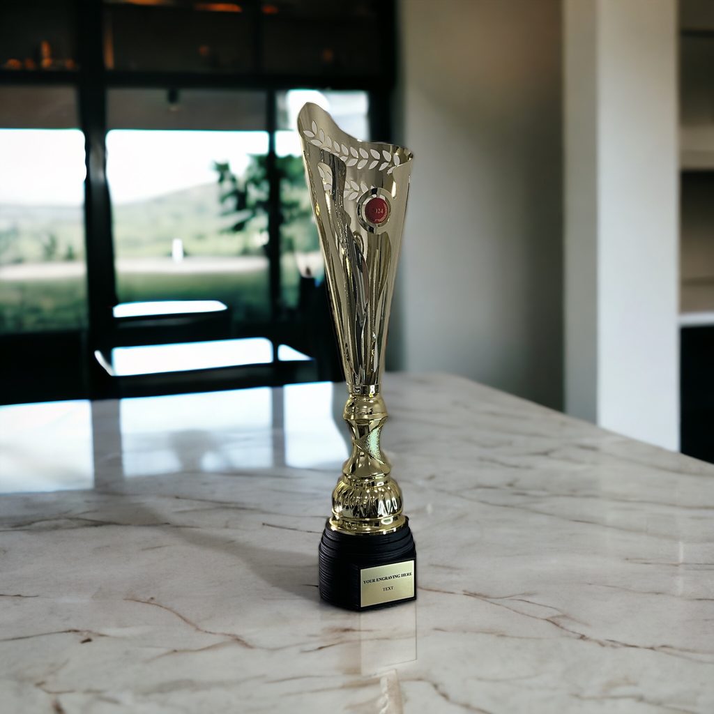 Sportovní pohár s dřevěným podstavcem.