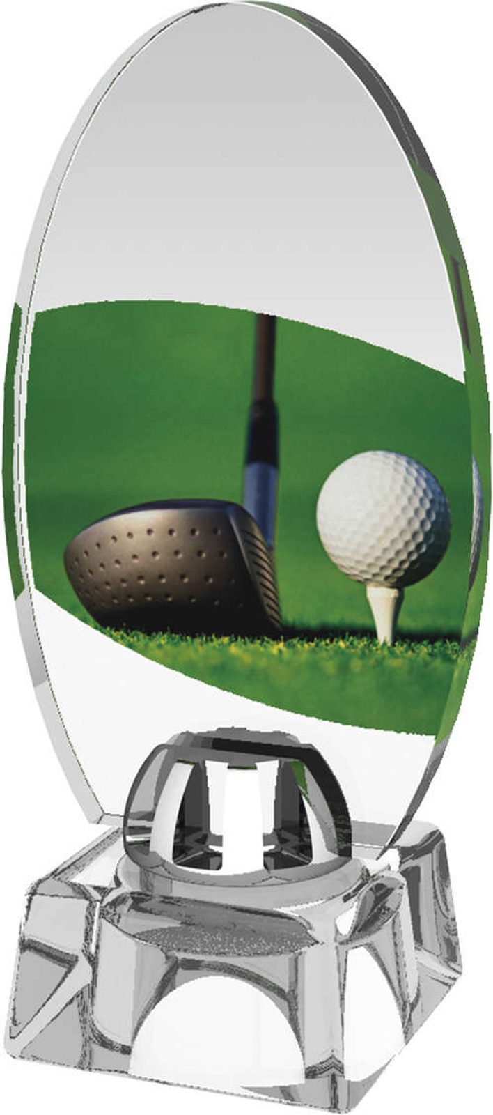 Golfová trofej s UV HQ potlačou. Kombinácia skla a akrylátu. Akrylátový motív - hrúbka 1 cm. Cena vrátane tlače bez štítku.